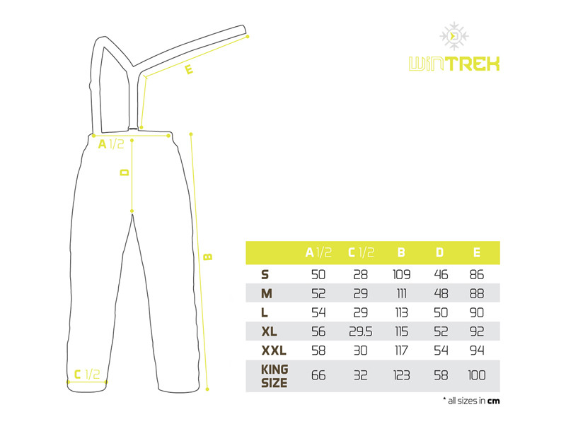 Nohavice WinTREK disponujú vreckami na zips po obidvoch bokoch, pričom zipsy sú prešité výraznou žltou textíliou a prekryté lemom z vodoodolnej tkaniny. Na páse sa nachádzajú gumené traky nastaviteľné podľa Vašej výšky a kompletne odopínateľné na suché zipsy. Samotný pás disponuje všitou gumičkou zvyšujúcou jeho flexibilitu a pružnosť. Vnútorná strana je tvorená hladkou prešívanou látkou, vďaka ktorej sa nohavice ľahko obliekajú a dobre nosia.