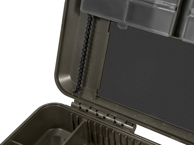 KlikBox Long je navyše vybavený platom z tvrdenej peny a špendlíkmi na pohodlné uchytenie koncových montáží. Pozdĺž celého odkladacieho priestoru na nadväzce nájdete mierku, podľa ktorej si budete vedieť presne určiť dĺžku vašich koncových montáží. Organizér je vyrobený z veľmi odolného plastu a k jeho komfortnému otváraniu a uzatváraniu poslúžia dva pevné plastové klipy.